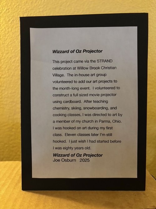 It turns out that Joe Osburn made the projector from cardboard and glue and was never a projectionist. He started out as a chemistry teacher in Parma, Ohio, a Cleveland suburb. He taught there for 34 years. He took his first art class at Cuyahoga Community College in Cleveland when he was 80 years of age. And he liked art so much that he took eleven more classes.
